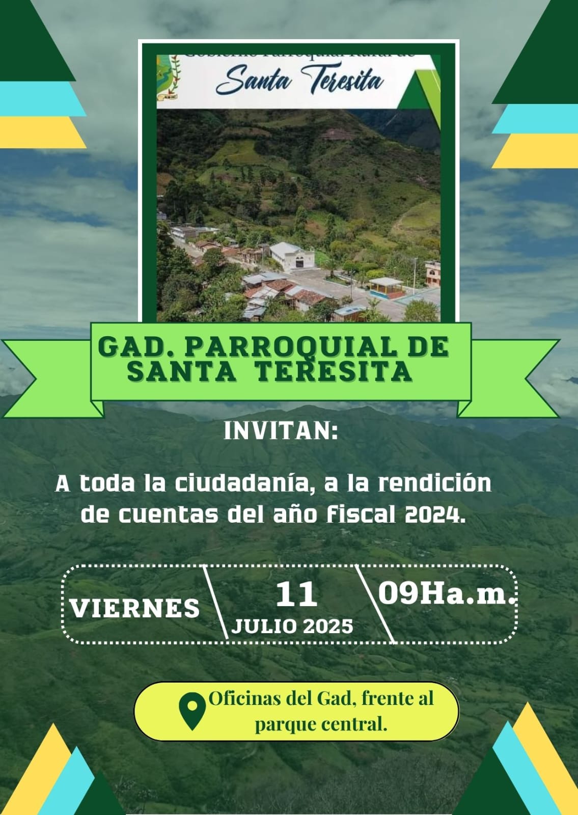 La parroquia de Santa Teresita, dotada de un Gobierno Autónomo Descentralizado Alternativo, se enfoca en mejorar la calidad de vida de sus habitantes mediante la ejecución de programas, proyectos y la gestión de convenios. Su visión proyecta una comunidad sólida y bien organizada en el 2015, gestionando eficientemente recursos económicos, productivos, sociales, culturales y ambientales. Los objetivos generales abarcan la planificación del desarrollo parroquial, el Ordenamiento Territorial y la coordinación con Gobiernos Cantonal y Provincial, buscando el desarrollo social, económico y cultural a través de un territorio ordenado que garantice el "buen vivir". La estrategia se basa en la identificación precisa de objetivos para cada sistema, con líneas de acción y proyectos factibles mediante la integración de actores clave a niveles local, cantonal, provincial y nacional.